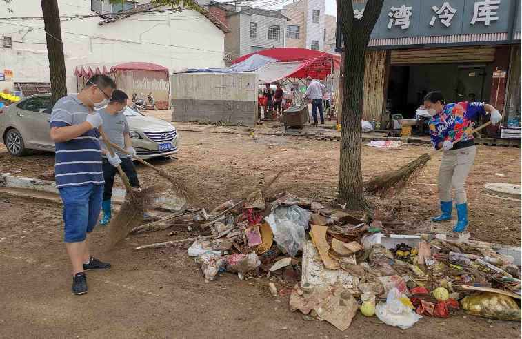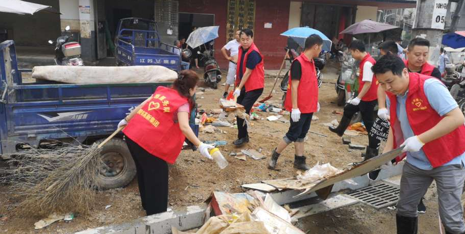 大灾过后,受灾城区一片狼藉,经开区管委会机关干部、高新集团职工驰援来办,在车顿桥路段清扫淤泥和垃圾。