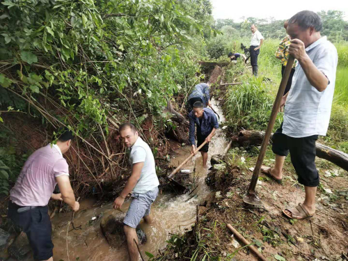 暴雨过后,华塘村伏林一组组长汤炳炎在安全巡查中发现一处河堤垮塌,造成沟渠严重堵塞。汤组长一边将巡查情况上报村委会,一边将消息发送到本组微信群中,积极发动组上村民开展志愿清理。在组长的身先士卒带动下,文运根、文广生等11位村民一呼而应,立马赶到了现场。当天正准备去给女儿过生日的钟国栋也毫不犹豫的取消行程,他说:“这是生我养我的地方,我们自己都不热爱还像话吗?”