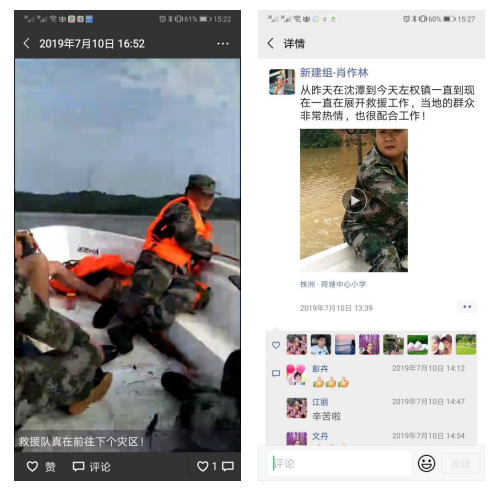 除了国瓷街道辖区内的组与组互帮、村与村互助,在其他乡镇的救援现场也出现了国瓷村民的身影。华塘村村民肖作林是新建组的小组长,也是街道的一名基层民兵。在洪水没有对该村组造成影响的情况,他毅然报名参加了市里的救援队,随队前往沈潭、左权镇参与抗洪救灾。3天的活动中,他不怕苦,不怕累,翻船落水后继续救援,成功解救身处险境群众近十人,为近百名群众送去了救援物品、物资。