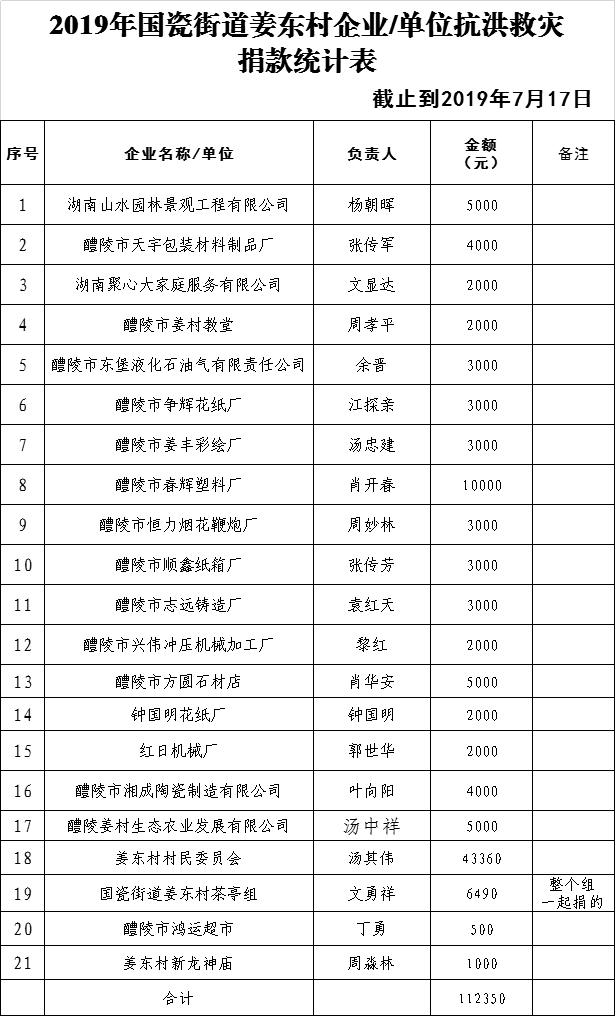 春辉塑料捐10000元;方圆石材捐5000元;姜村生态农业捐5000元;湖南山水园林景观捐5000元;茶亭组捐款6490元......