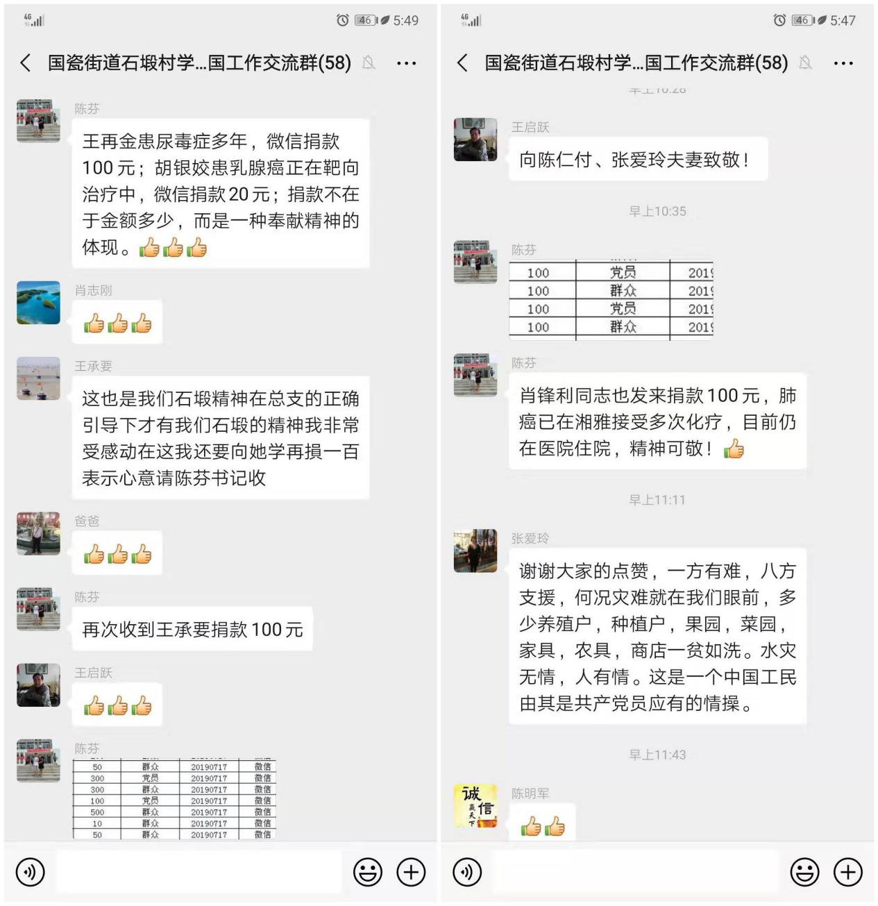 “陈主任,钱不多,是我的一点心意,请您帮我转交。”17日下午,石塅村民政专干陈芬一出门就遇上刚从摩托车上下来的村民彭云香。年近6旬的彭云香家境并不富裕,平时都在隔壁村照顾年迈的母亲,收到捐款的倡议书,不会微信、不会骑车的她租了摩托车来到村委会捐献了300元,还动员远嫁外地的女儿也捐了款。