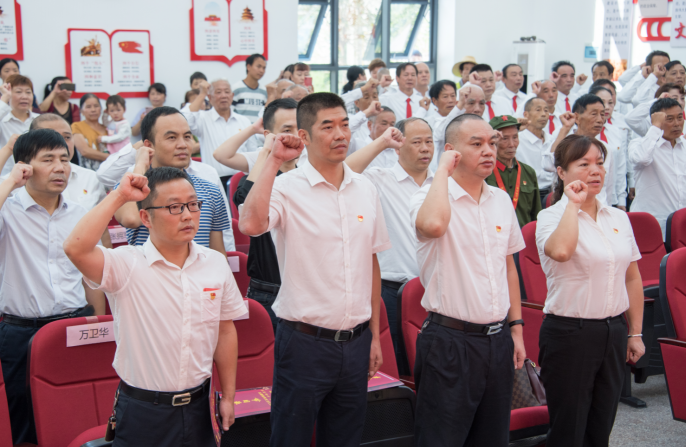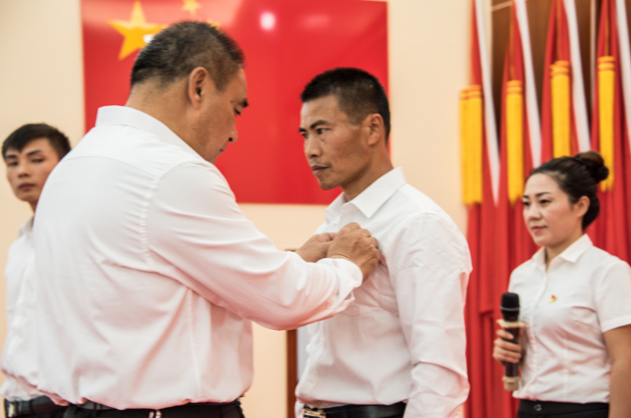 庄严的国歌奏响后,全体党员重温了入党誓词。在上级领导、全体党员和与会群众的见证下,2名预备党员面对党旗,郑重许下“为共产主义奋斗终身” 的誓言,党总支书记王喜金同志为他们佩戴党徽。