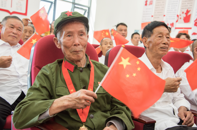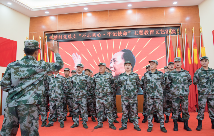 伴随着激昂的旋律,华塘村党员退役军人踏着坚定有力的步伐,喊着“听党指挥、服从命令、不忘初心、牢记使命”的口号,踏着整齐的步伐向我们走来。