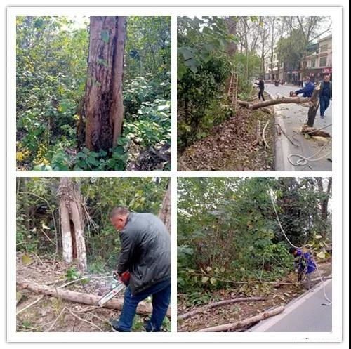 得知情况后姜东村第一时间向街道汇报,并派人现场调查核实,第二日就组织人员设备对病树进行清除作业。工作人员在施工现场设置了施工安全标志和隔离设施,指挥过往的车辆行人有序通行,确保施工和行车两不误。