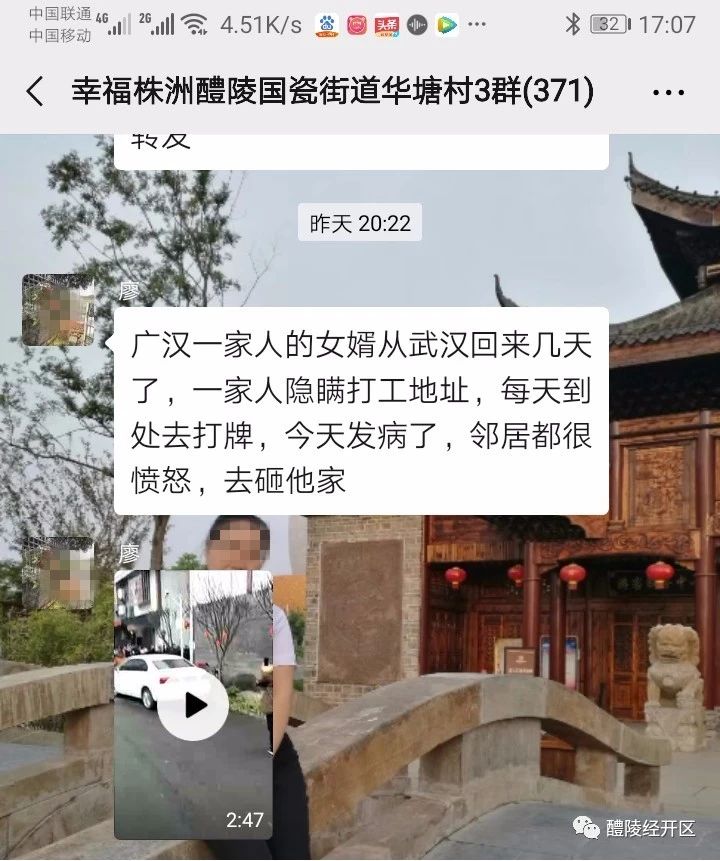 1月30日下午,国瓷街道纪工委接到市纪检监察系统关于“幸福株洲监督与服务微信群反映涉及疫情问题线索”。幸福株洲醴陵国瓷街道华塘村3群内,一昵称为“廖”的女子于20点22分发布短视频并配文称:“广汉一家人的女婿从武汉回来几天了,一家人隐瞒打工地址,每天到处去打牌,今天发病了,邻居都很愤怒,去砸他家。”内容发布后,引起村民议论纷纷,给部分村民造成心里恐慌。