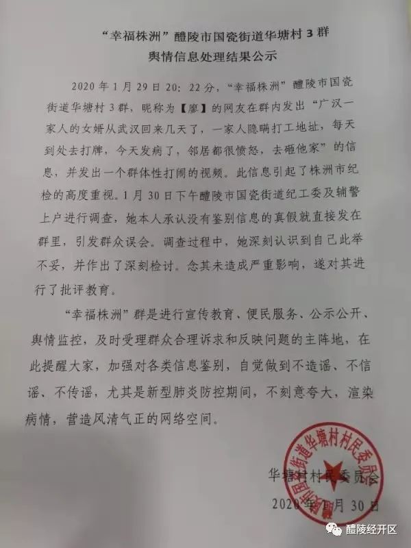 村干部对廖某不负责任的行为进行了严肃批评,责令本人写出深刻检讨,并将处理结果以“舆情信息处理结果公示”的形式在“幸福株洲”国瓷街道华塘村群内进行了发布。以此提醒广大村民,不造谣、不信谣、不传谣,营造风清气正的网络空间。