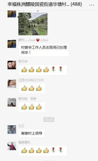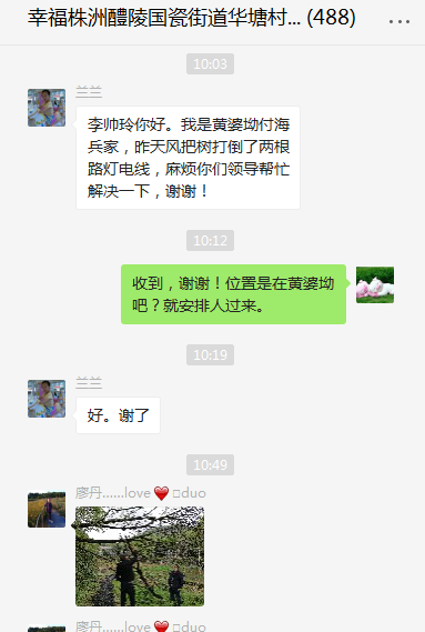 “昨天大风把树吹倒,压在了两根路灯电线上,情况十分危险,麻烦你们帮忙解决一下。”上午10点3分,“幸福株洲”华塘村网上群众路线微信1群黄婆坳组村民付海兵在群里反映问题。