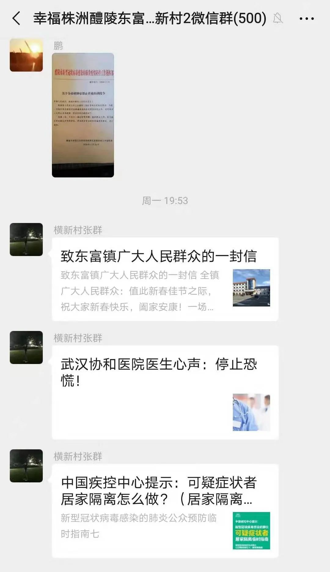 宣传引导零距离。充分发挥“幸福株洲”村级微信群宣传阵地的作用,及时传达各项强农、惠农政策,及时辟谣澄清,科学运用典型案例开展好法纪教育和警示教育,引导基层广大干部群众熟悉政策信息,增强纪法意识,切实维护自身权益。本次疫情期间作用尤其凸显,镇村通过“幸福株洲”微信群宣传政策、募集志愿者、统筹安排工作。同时,在“幸福株洲”微信群内宣传“十带头”、“十不准”等疫情防控健康科谱常识。针对龙源村民易某在微信群内发布不实信息的问题,镇党委政府第一时间安排人员核实,并联合派出所当日下午5点进行处理并发布了辟谣视频。