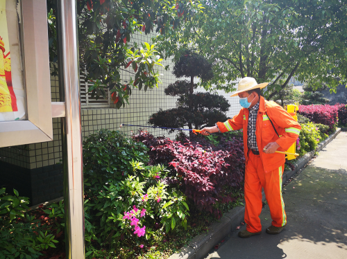 消毒人员身背喷雾器进入教室,将桌椅消毒后挪到一旁,再对讲台、储物间、墙壁、地面一一仔细喷洒,严格按照卫生消杀标准,全面、反复、消杀到位。此外,对食堂、厨房、办公室、走廊和操场等公众场所和重点区域进行了“地毯式”喷洒消毒作业,连厕所、花坛也不放过,不留一个死角。