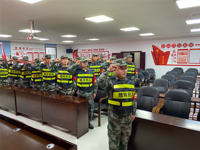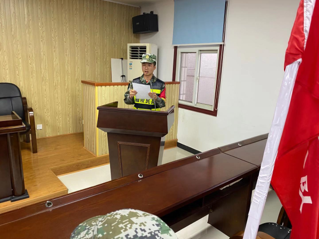 在雄壮的(中国人民解放军军歌)中拉开序幕。此次点验严格按照民兵点验大纲的八项基本程序进行,会上东富镇民兵排长带领民兵们进行了宣誓,新入队队员进行了发言。东富镇综合应急排有反恐维稳、综合勤务、工程机械、防汛抗洪四个班,担任着积极参加社会主义现代化建设,带头完成生产和其他各项任务;担负战备勤务,保卫边疆,维护社会治安;随时准备参军参战,抵抗侵略,保卫祖国的任务。排长林琨表示,为了应对此次强降水,全排已经进入战时状态,随时出动,时刻做好抗洪抢险的准备。