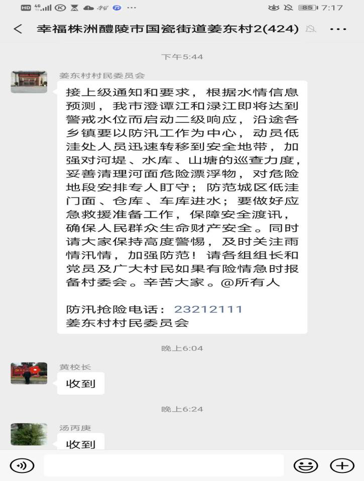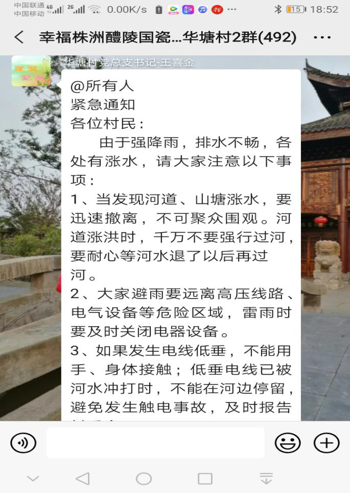 利用微信群、广播主动、及时发布汛情、灾情、险情的准确消息,街、村干部进村入户做好宣传教育工作,提高辖区群众自我防灾意识,增强应急自救能力。密切关注雨情,落实24小时信息畅通制度,确保遇到紧急状况能第一时间报告,处置,响应。
