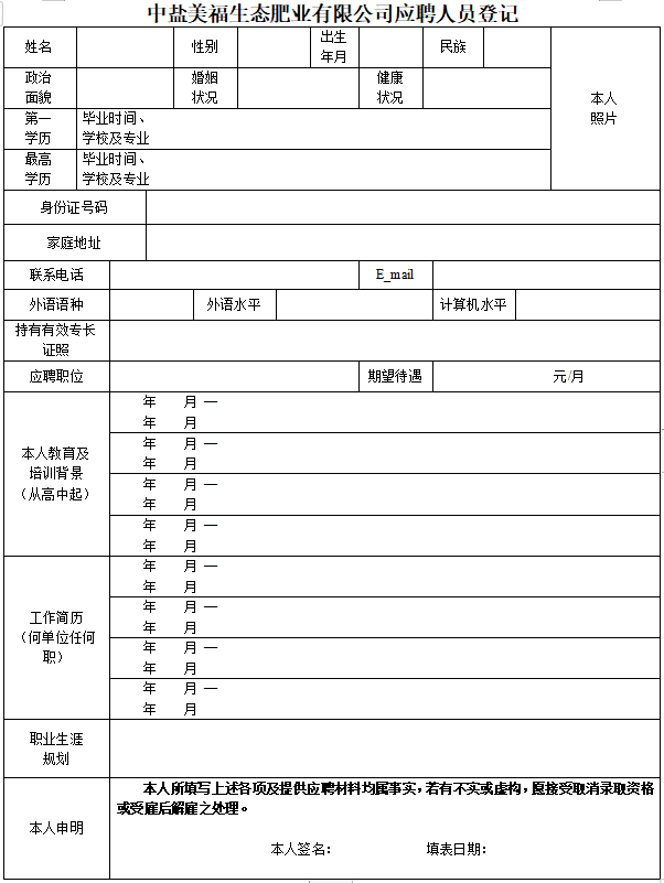 附件:中盐美福生态肥业有限公司应聘人员登记表