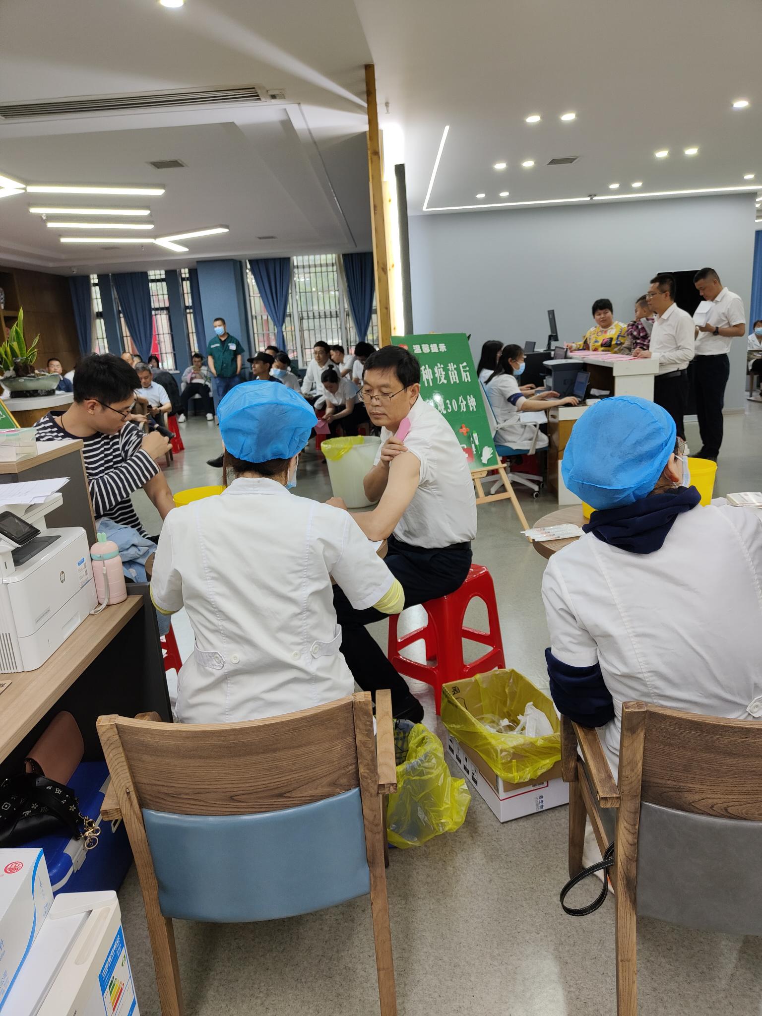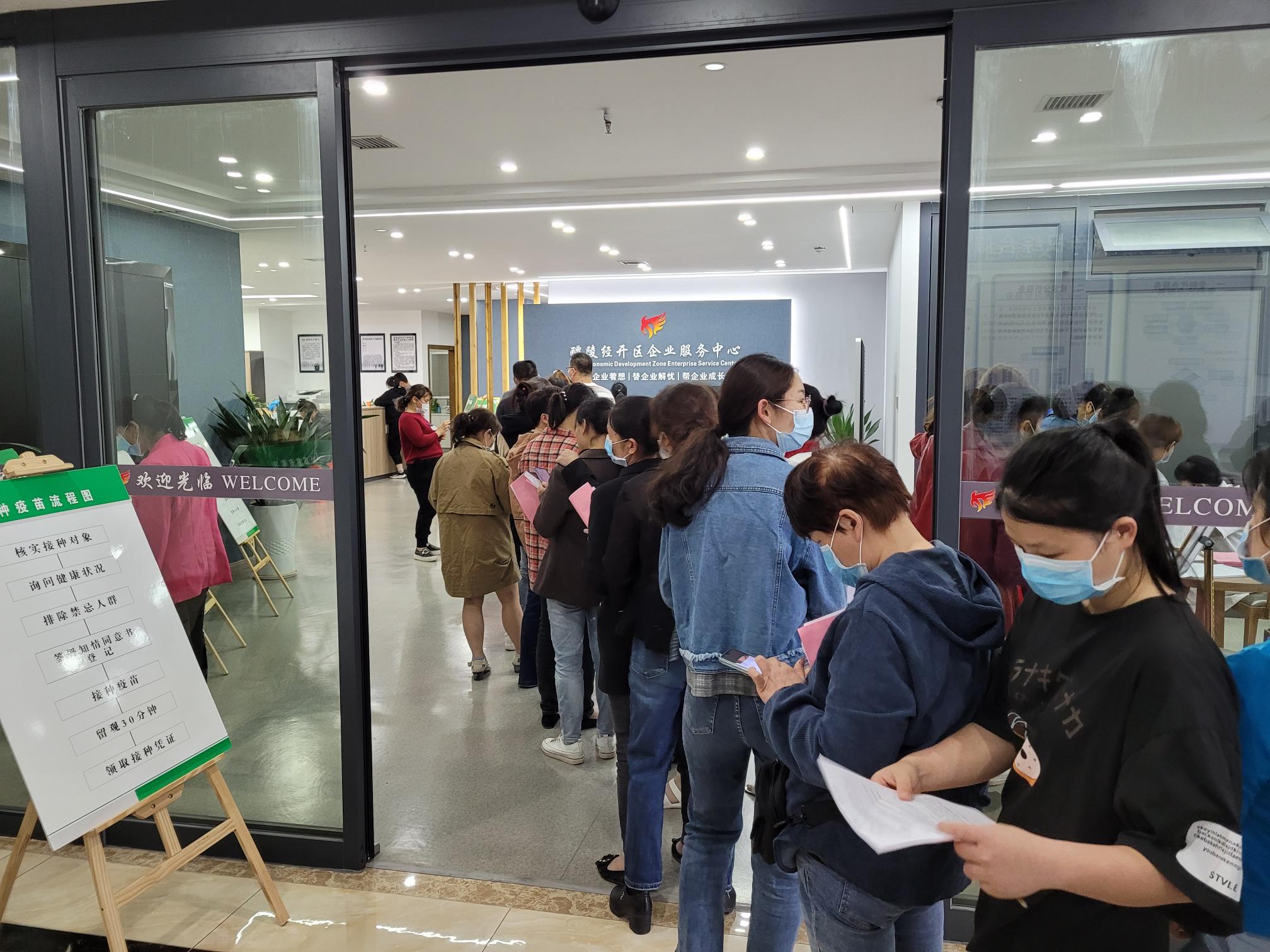 为了不影响企业的生产经营活动,企业服务中心联系社区医院在中心办公室设立了临时接种点,安排了专人维护现场秩序,做到园区各类人群的接种工作既压茬推进,也无缝衔接。企业服务中心积极配合医护工作者,引导接种人员,并备好口罩和茶水,为接种工作提供贴心服务。首批接种人群包括经开区机关工作人员、陶润会员工共计300余人。