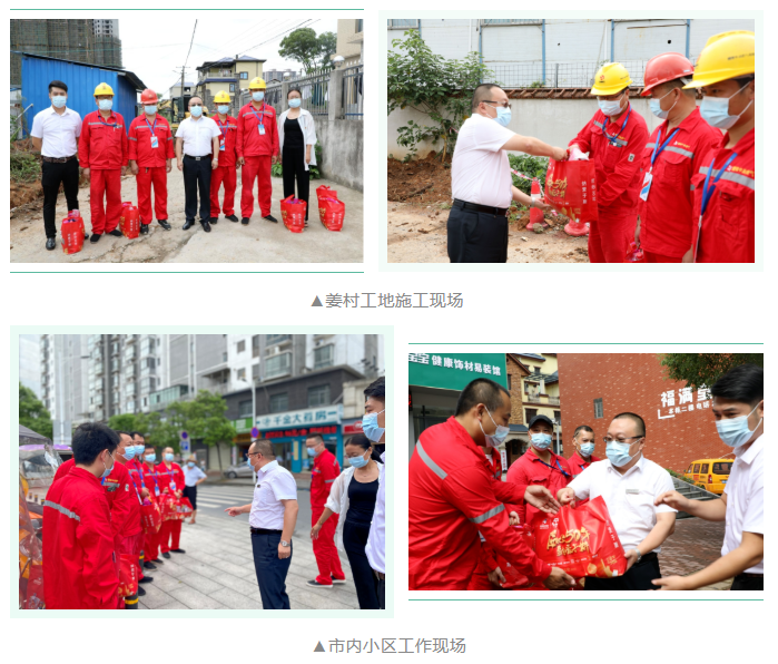 慰问组一行先后来到了五环都会、瑞景嘉苑和姜村工地等现场,陈总带头与一线员工亲切交谈,详细了解现场工作人员情况,叮嘱大家严格做好疫情防控措施及防暑降温工作,并高度赞扬了他们在特殊时期不讲条件、挺身而出、冲锋在前、坚守岗位的责任心和大无畏精神,同时要求各站队根据夏季高温状况,灵活调整现场作业时间,尽可能避开高温时段在烈日下户外作业,为一线员工创造良好的工作环境。