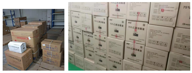 意料之中,在公司仓库,我们看到了满满储备的口罩、84消毒液、酒精、苍术和艾叶等疫情消毒应急物资。