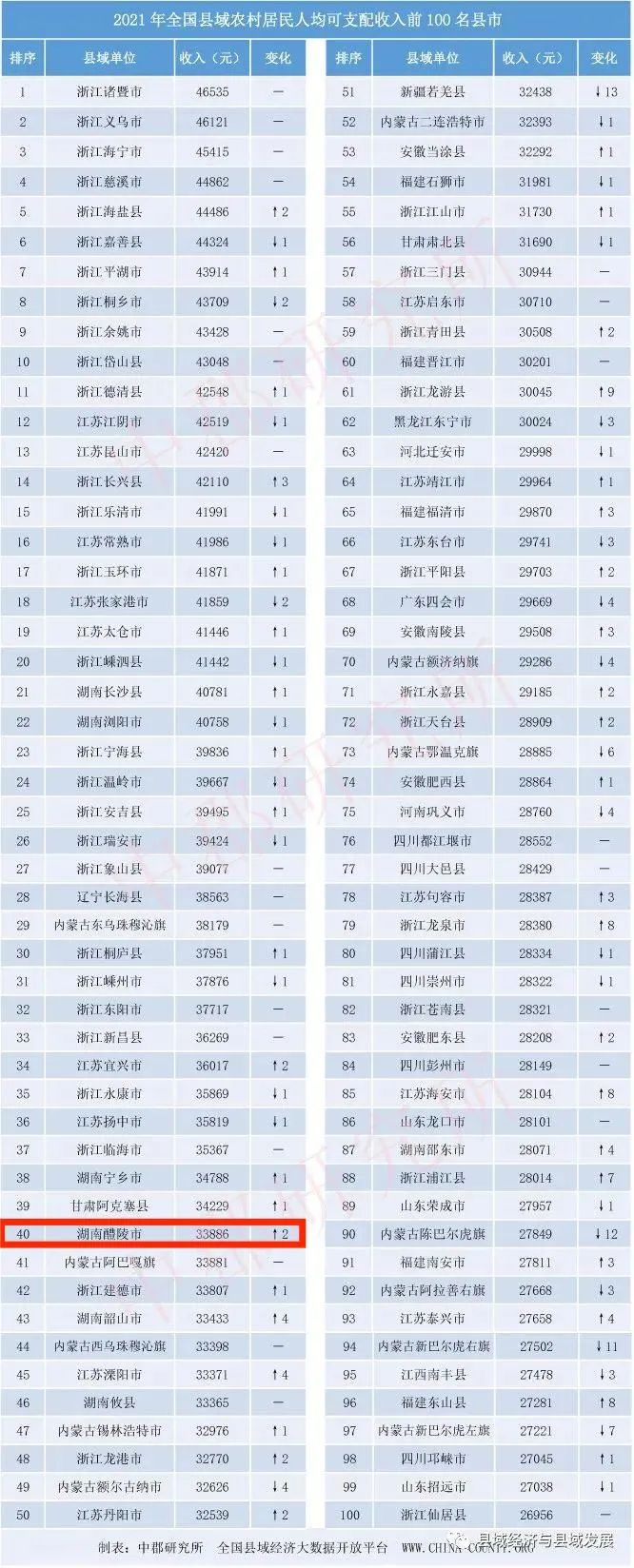 近日,中郡研究所完成并发布《2021年全国县域农村居民人均可支配收入监测报告》,揭晓全国县域农村居民人均可支配收入前100名县市名单,醴陵位列第40位。