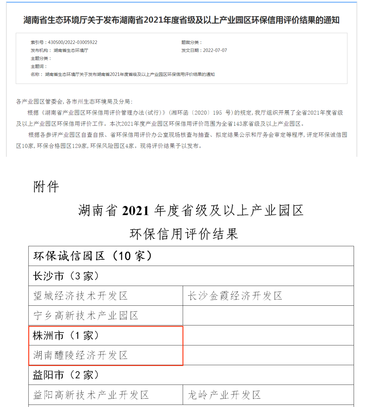 近期,湖南省生态环境厅正式发布《湖南省2021年度省级及以上产业园区环保信用评价结果》,湖南醴陵经济开发区获评“环保诚信园区”,成为全省10家环保诚信园区之一,也是株洲市唯一获此殊荣园区。