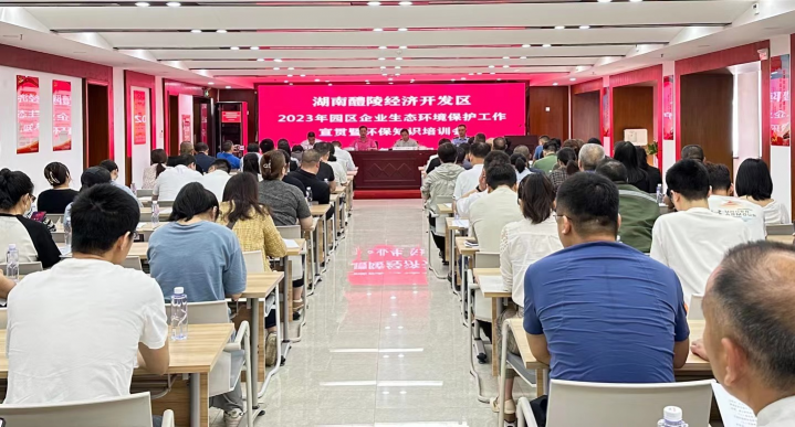 为全面贯彻党的“二十大”精神和习近平生态文明思想,深入打好园区污染防治攻坚战,让企业充分了解当前生态环境保护工作的政策形势,强化企业环保主体责任,推动园区绿色高质量发展,5月26日上午,醴陵经开区召开2023年园区企业生态环境保护宣贯暨环保知识培训会。会议由经开区企业服务中心主任邱素纯主持,经开区党工委委员、纪工委书记刘高飞出席并讲话,园区近100家企业参加。