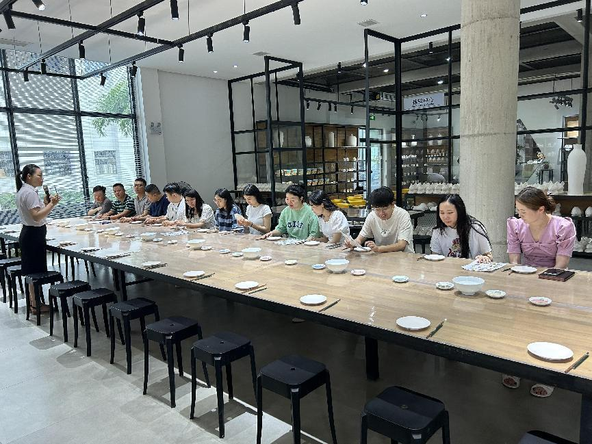 在陶瓷绘画体验室,老师现场教学介绍了勾线、汾水的相关技艺和手法,大家热情高涨,在素坯上充分发挥想象力和创造力展开创作,勾画出一件件独具创意的作品。