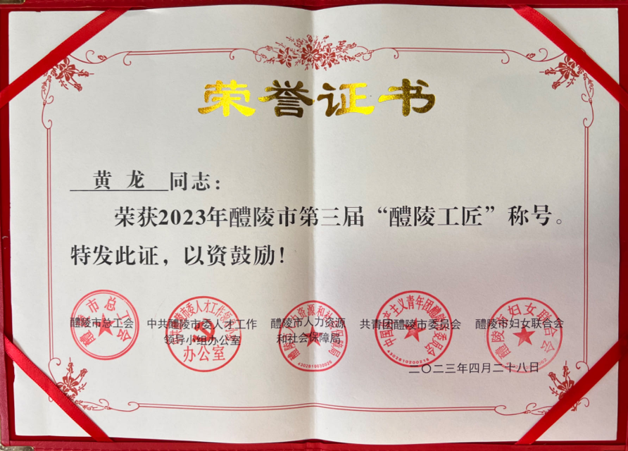2023年4月,由醴陵市总工会联合市委人才办、市人社局、团市委、市妇联共同举办的庆祝“五一”国际劳动节暨第三届“醴陵工匠”颁奖典礼上荣获第三届“醴陵工匠”称号。