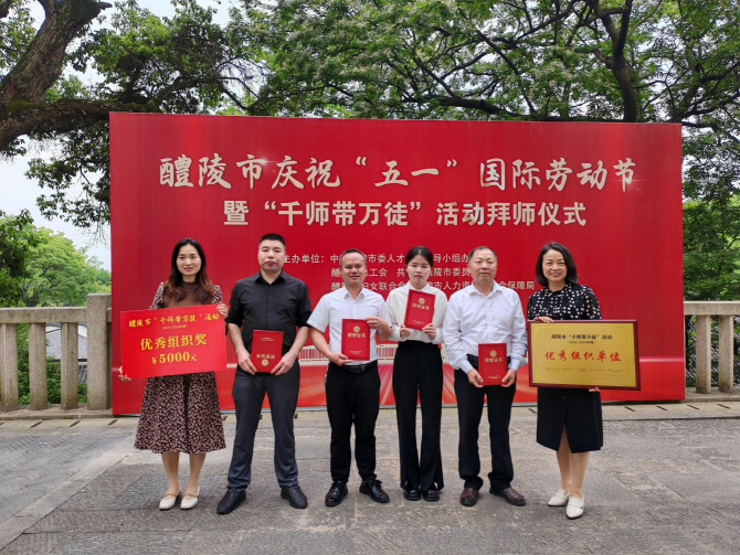 会上,市级领导为35对优秀师徒颁发聘书,园区醴泉窑黄小玲和钟伟玲师徒、振美陶瓷宋龙飞和江南春晓师徒、尚方窑张正平和徐珊师徒、华联瓷业邹建华和李蒙师徒、旗滨玻璃李础源和李卓师徒、时代金属张鹏和朱宇轩师徒获评“优秀师徒”荣誉称号;经开区工会联合会、湖南华联瓷业股份有限公司工会委员会、株洲醴陵旗滨玻璃有限公司工会委员会获得“千师带万徒”活动“优秀组织单位”荣誉;陶润会谢柳英和冯昕愉师徒、红官窑姚文和易浩成师徒获“优秀师徒”提名人选。