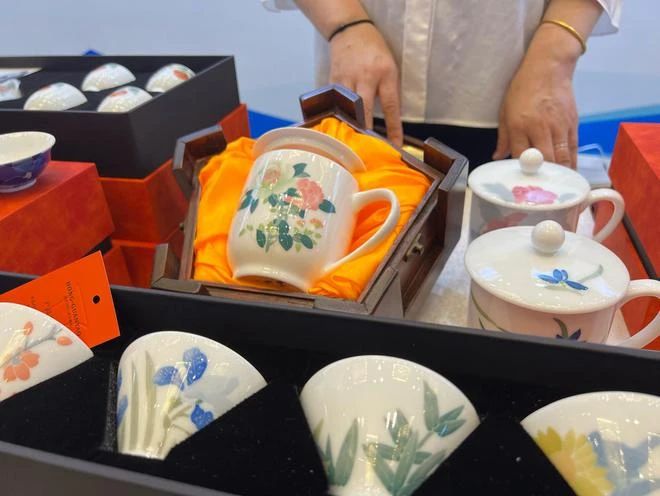 “这款花纹是四季花卉中的月季,代表月月红火,采用了国家级非遗醴陵釉下五彩瓷烧制技艺。你看,它十分轻薄透亮,薄如纸、明如镜、声如罄。”现场的名品展会上,华联瓷业展台吸引了不少人驻足欣赏,一套精美的醴陵釉下五彩瓷茶具更是吸引了大家的目光,华联瓷业工作人员正向大家热情介绍。