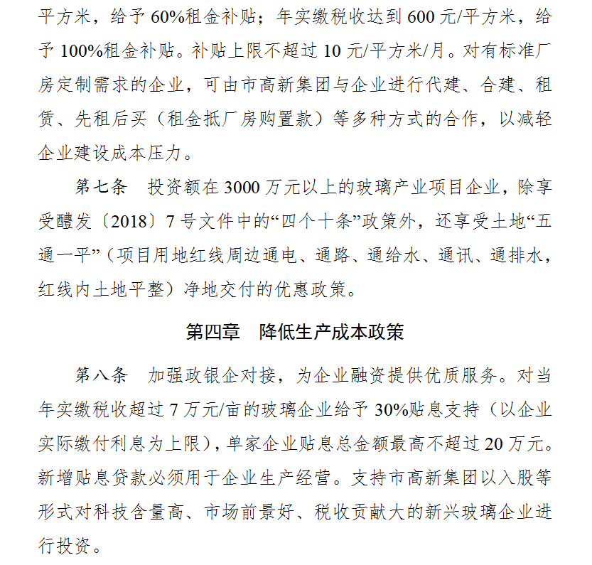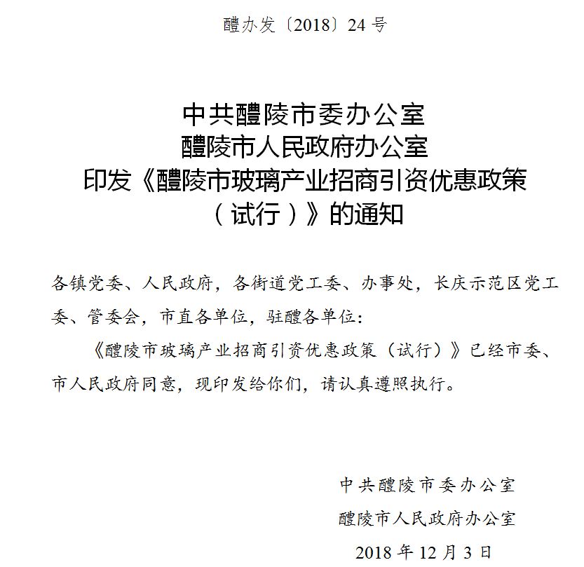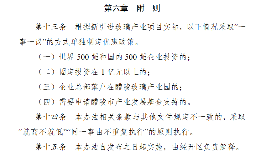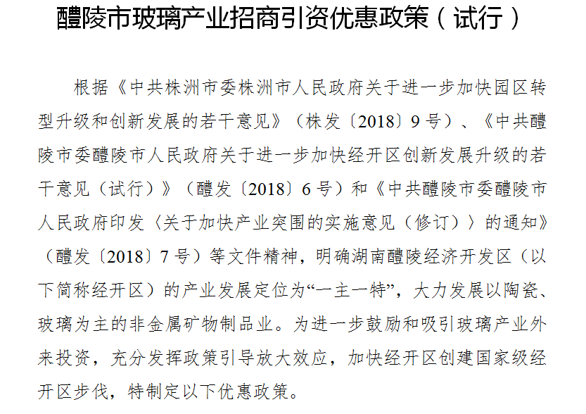 12月4日,从醴陵经开区招商合作局传来喜讯,针对醴陵玻璃产业园的《醴陵市玻璃产业招商引资优惠政策(试行)》的通知(以下简称“玻璃十五条”)正式出台。