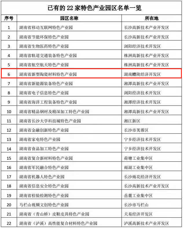 2015年,省发改委会同省科技厅、省经信委、省财政厅及长株潭三市,根据各地产业基础和特色优势,率先在长株潭地区,依托现有省级和国家级园区,以园中园等形式,布局了首批17家特色产业园。在首批17家特色产业园的基础上,之后又陆续批复了5家特色产业园。目前,全省共有特色产业园22家,长沙12家,株洲4家,湘潭5家,湘西州1家,其中我们湖南醴陵经济开发区就是湖南省新型陶瓷材料特色产业园区。