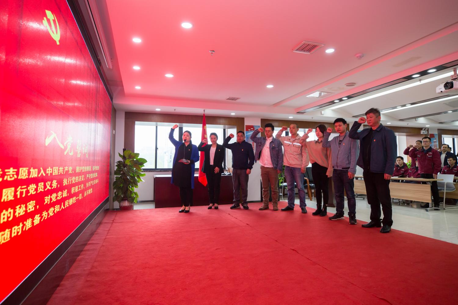 经开区企业党委专职副书记张新潮宣读《中共湖南醴陵经济开发区工作委员会关于批准中共预备党员的通知》。随后,7名新党员在易爱玲同志的带领下,一起紧握右拳,面向党旗,庄严宣誓。“我志愿加入中国共产党,拥护党的纲领,遵守党的章程……”誓词铿锵有力,党员们目光坚毅,郑重许下对党的承诺,表达着为共产主义事业奋斗终身的决心。参加会议的其他党员也纷纷起立,重温入党誓词,再次接受精神洗礼。